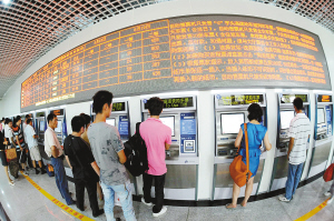 8月18日,南京火车站发售沪宁城际高铁车票的30台自动售票机正式启用。自动售票机设置在新开的自助售票大厅内,旅客只需在售票机上点击选择日期、发站、到站、车次、车票张数和席别并投入纸币,很快就能完成购票,也可以购买返程票。自动售票机每次操作最多能发售10张车票。 新华社记者 孙参 摄