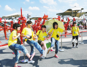 8月19日,几名游客在上海世博园内的“CHINA功夫”陶瓷雕塑前合影留念。 根据上海世博会官网统计,截至当日17时,累计参观者已达4214.72万人次。 新华社记者 李百顺 摄