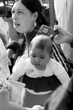 | 8月19日,一名抱着孩子的罗姆(吉卜赛)妇女抵达罗马尼亚首都布加勒斯特。 新华社发 |