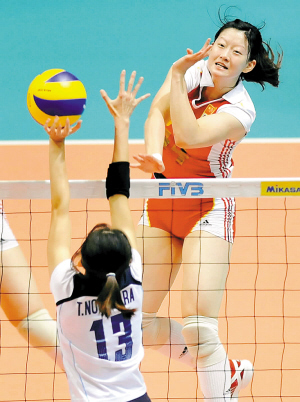| → 20日,在世界女排大奖赛香港站比赛中,中国队以3:1战胜泰国队。图为陈丽怡(右)在扣球。