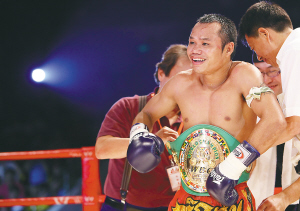 | 戴上金腰带的侗姆安开心不已。 本报记者 张杰 摄 |