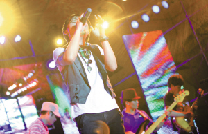 | ↑8月20日晚,海南朝前走———本土乐队展演首场展演在海口假日海滩音乐广场举行。图为以海南话歌曲为主打路线的老爸茶乐队在表演。海南日报记者 张杰 摄 |