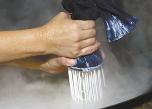 把米团放入蒸笼中蒸一个小时,然后取出放在石臼中舂烂,边椿边倒入适量的熟米浆,直到柔软适度,易成条状。
