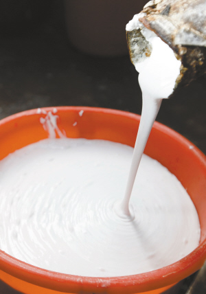 然后用冷水泡米一二日,待充分吸收水分后,取出磨成米浆。魏四妹说以前磨米浆都用石磨,现在大多改用粉碎机,将米粉碎成稀泥状。然后把米浆用纱布包裹,放在木质的容器中不断揉搓,这是非常重的体力活,在揉搓过程中挤出水分,米浆逐渐变成米团。