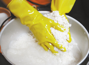 然后用冷水泡米一二日,待充分吸收水分后,取出磨成米浆。魏四妹说以前磨米浆都用石磨,现在大多改用粉碎机,将米粉碎成稀泥状。然后把米浆用纱布包裹,放在木质的容器中不断揉搓,这是非常重的体力活,在揉搓过程中挤出水分,米浆逐渐变成米团。