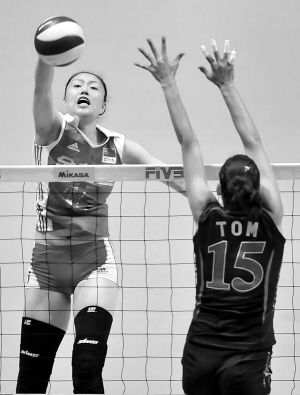 | 马蕴雯(左)在比赛中扣球。 新华社发