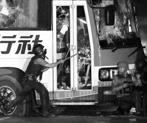 据当地媒体报道,傍晚时分,大客车曾试图向前开,警方开枪打爆轮胎,以阻止其移动。随后,警方把后挡风玻璃打碎,试图强攻大客车,与劫匪进行交火。