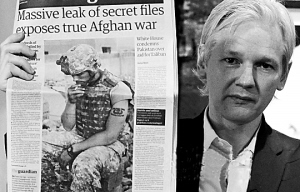 | “维基揭秘”网总编辑朱利安·阿桑奇手持揭发阿富汗战争真实状况的报纸。 |