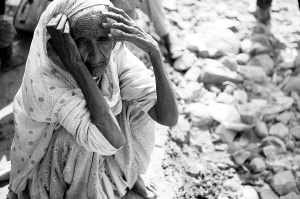 8月23日,在巴基斯坦旁遮普省南部的穆扎法加尔附近的洪灾地区,一名老妪蹲在地上。 由于当地灾民众多,现有的灾民营地无法容纳,部分灾民需要在野外露宿等候救援。 新华社记者 吕小炜 摄