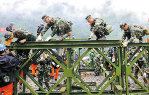 8月23日,武警官兵和公路部门的工作人员在加紧架设钢架桥。当日,云南贡山特大山洪泥石流灾害搜救工作进入第六天。武警官兵和当地公路部门的工作人员正全力在东月谷河上架设战备钢架桥,争取早日抢通灾区公路交通。22日下午,贡山泥石流灾区东月谷河上的木质便桥被上涨的河水冲毁,导致贡山县城到泥石流灾害现场、州府六库镇的公路交通再次中断,严重影响县城和救灾现场的物资保障、人员交通。 新华社记者 蔺以光 摄