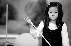 世界女子九球锦标赛资格赛23日在沈阳开赛。年仅10岁的小姑娘王雯在第一场比赛中轻松战胜对手。尽管第二场比赛以一局惜败,但这个练习台球仅一年多、球风却沉稳老练的小姑娘引起赛场内外的关注。 新华社发