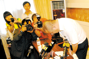| 8月26日,河南航空公司监事会主席刘航在通气会上鞠躬致歉。当日,伊春飞机失事首次新闻通气会在黑龙江省伊春市召开。 新华社记者 李勇 摄 |