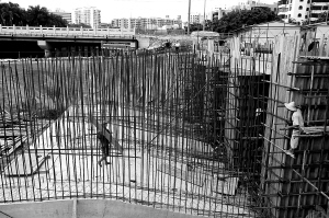 8月25日上午,在海口市美舍河东风桥处的市中心区水网动力工程东风桥泵站,工人正在加紧进行泵站墙体的测量与施工。据了解,东风桥泵站工程是海口市水环境整治水网动力工程的重点工程之一。目前,该工程进展顺利,计划年底整个工程竣工。 本报记者 张杰 摄
