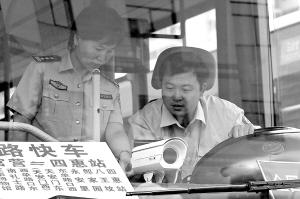 8月27日,1路汽车驾驶员正在向北京市的交管部门的工作人员了解自己“新伙伴”的“脾气”。 从当日起,北京市交管部门将在长安街、前三门大街、平安大街、两广路4条大街13条重点线路的公交车上安装110套监测设备,实时拍摄社会车辆占用公交车道的违法行为,通过移动的公交车辆对公交专用道限行时段内进行“全天候”监控。 新华社发(张宇 摄)