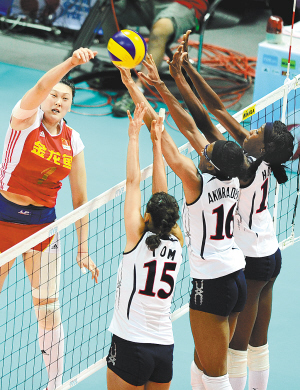 | 右图:中国队主攻手王一梅(左一)的扣球遭到美国队员的集体拦网。新华社发 |