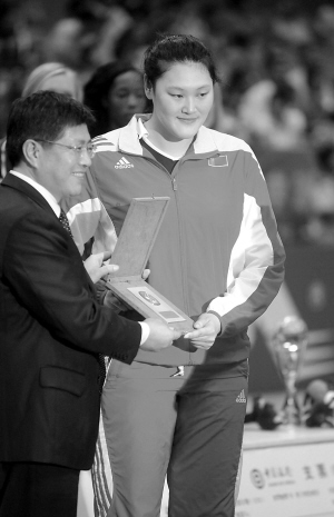 | 8月29日,2010世界女排大奖赛总决赛在宁波北仑落幕,中国队球员王一梅(右)被评为本次比赛最佳发球手。 新华社发 |