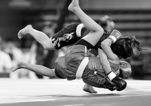 | 8月29日,在世界武搏运动会武术散手女子52公斤级决赛中,中国选手鄂美蝶(上)以2:0战胜土耳其选手艾谢贝利万,获得冠军。 新华社发 |