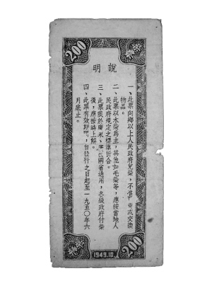 这张柴票设计朴实无华,票证正面黑色纹饰环绕成矩形图案,中间用横排“一九四九年十月印發”字样将票面呈黄金线分割,矩形四角对称印着“200”、“柴票”字样,采用文字均为繁体字,票面编号648320,说明其当时发行量不低。