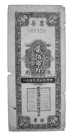 1949年3月,中原临时人民政府在开封成立。据《广东省粮食志》和《南阳地区粮食志》等书记载,中原临时人民政府筹备成立时,曾发行了一套粮秣票,为配合中南军区南下,所到之处在粮秣票上加印不同省份名称,如“粤桂”、“湘”、“鄂”、“赣”、“豫”等,这些加印不同省份的粮秣票,均印发于1949年10月,目前仅发现有加印“粤桂”的中原临时人民政府粮秣票,主要供两省解放军部队剿匪和党政机关干部下乡使用,分为大米票、柴票、草票和料票四种,使用到1950年6月底。已收集到的面额为1斤、50斤、100斤、200斤、300斤的大米票和面额为1.5斤、10斤的柴票及100市斤的马草票。其他几种票均未发现实物。我省发现的这张柴票,则是目前为止发现的面额最大的中原临时人民政府柴票。
