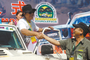 | 在第二届中国(三亚)国际热带雨林汽车越野挑战赛发车仪式上,陆大进(右)鼓励海南车手。 |