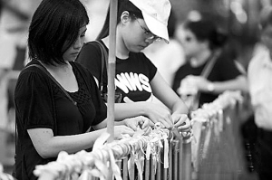 ① 8月29日,游行者在维多利亚公园默哀。② 8月29日,游行市民把黄丝带绑在遮挡花园的栏杆上,哀悼遇难同胞。 新华社记者 吕小炜 摄
