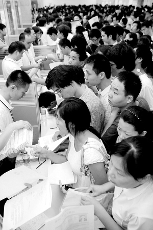 8月26日,在河南省人才交流中心二楼大厅里,上千人排成两条长龙等待向富士康公司递交个人资料和面试,场面异常火爆。由于应聘者太多,富士康招聘现场准备的报名表格也供不应求。