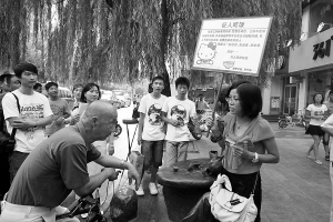 “乙肝女”济南街头请人吃饭 8月29日,网民“锄草”(右一)在济南街头邀请路人共进晚餐。 网民“锄草”在高一时检查出是乙肝病毒携带者,在人们异样的眼光中学习成绩一落千丈,高考落榜。1997年她东渡日本,考取研究生,并在那里工作、结婚。为让更多的人消除对乙肝病毒携带者的歧视,2010年初她辞职回国,全身心投入到这项公益事业中,通过请普通民众吃饭,宣传乙肝不会通过共餐等日常生活接触传染,消除乙肝恐惧。 新华社发