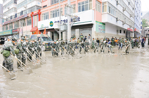 | 8月30日,兰州军区某部官兵对县城淤泥进行清理。 新华社发 |