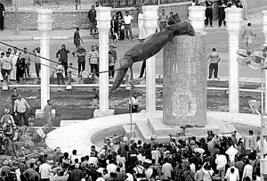| 2003年4月9日,巴格达菲尔杜斯广场,萨达姆雕像在伊拉克民众瞩目中被推倒。 |