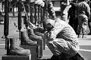 | 伊拉克战争五周年,驻伊美军阵亡总人数将近4000人,美英部队也都各有伤亡,图为一名美国海军陆战队下士在加利福尼亚州彭德尔顿堡悼念阵亡战友。 |