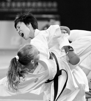 | 8月31日,在2010年北京首届世界武搏会空手道女子50公斤级铜牌争夺战中,中国选手李红(上)以2比0战胜俄罗斯选手艾琳娜·波诺马列娃,摘得铜牌。 新华社发 |