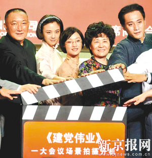 据新华社北京9月1日电 (记者白瀛)电影《建党伟业》开机已近半月,剧组9月1日在中影怀柔影视基地迎来整部电影的重头戏———中共一大代表齐聚、共同探讨会议召开的场景。导演韩三平、黄建新,演员刘烨、李晨、周迅等主演齐亮相,参加一大的13个代表及部分演员也揭开了神秘面纱。