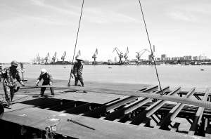 | 白马井—洋浦跨海大桥正在加紧施工。图为工人铺设桥墩平台。 本报记者 苏晓杰 摄 |