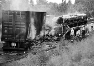 9月3日,在吉林省境内的长平高速164公里+100米处,发生一起客货车相撞事故,目前已造成17人死亡、35人受伤。据介绍,事故发生时,一辆从哈尔滨方向驶来的山东籍的大型卧铺客车,突然穿越隔离带,撞上对面车道行驶的一辆轿车尾部,后与一辆辽宁籍的厢式货车正面相撞,并起火。 新华社记者 肖潇 摄