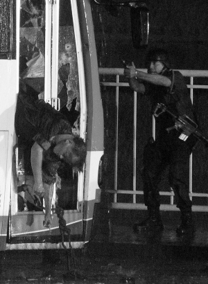 | 8月23日,劫持中国香港旅游团的菲律宾劫匪(左)被击毙后尸体挂在车门上。 新华社/路透 |