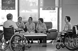 9月4日,在杭州市社会福利中心休养楼大厅,96岁的杭州老人叶杏云(左二)与一起休养的老姐妹及护理员聊天。据杭州市建设健康城市工作领导小组办公室介绍,杭州市居民在2009年人均期望寿命为80.26岁,达到发达国家居民的健康水平。 新华社记者 谭进 摄