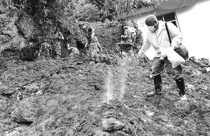 截至9月4日17时,发生在云南省保山市隆阳区瓦马乡大石房村民小组的特大山体滑坡已致24人死亡,24人失踪。图为卫生防疫人员在保山灾区滑坡体废墟上消毒灭菌。 新华社记者 陈海宁 摄