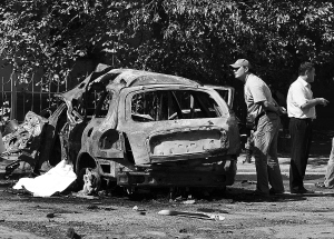 9月4日,在俄罗斯达吉斯坦共和国首府马哈奇卡拉市,调查人员检查被炸毁的共和国民族政策、对外联系和信息部长别克穆尔扎·别克穆尔扎耶夫乘坐的汽车。 别克穆尔扎耶夫乘坐的汽车4日在马哈奇卡拉市发生爆炸,司机死亡,别克穆尔扎耶夫及其保镖受伤。 新华社/路透