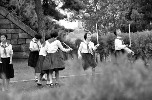 | 9月5日,在朝鲜首都平壤大同江边,几名女学生在排练节目。
