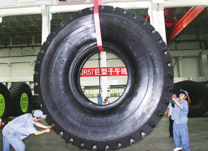 9月6日,单胎重3.5吨、外直径3.6米的巨型工程子午胎在三角集团山东威海第二生产基地成功下线,创造了国产巨型工程子午胎的新纪录。工程子午胎主要为工程和矿山机械配套,目前该生产基地的一、二期巨型工程子午胎项目年生产能力已达6000条。 新华社发(于启波 摄)