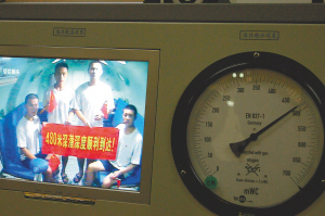 仪表显示实验舱内加压到480米,潜水员打出横幅纪念这一时刻。