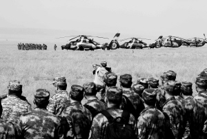| 9月7日,中方直升机抵达哈萨克斯坦马特布拉克训练场。 新华社发