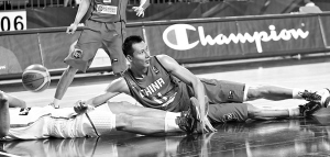 北京时间9月8日凌晨,土耳其世锦赛中国男篮与立陶宛队的1/8决赛结束,中国队以67:78不敌对手,无缘八强。图为易建联与对方球员倒地争抢。 新华社发