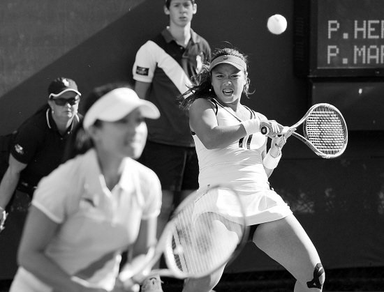 北京时间 9月7日,在2010美国网球公开赛中,海峡组合、中国队选手郑洁与中华台北选手詹咏然晋级八强。图为郑洁(左)/詹咏然在比赛中。新华社发
