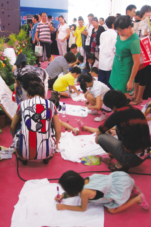 本次房展,观展者不仅可以观赏名楼靓房,还可以自己动手现场涂鸦,将自己心目中最美的楼盘勾勒出来。这个由主办方举办的“文化衫上画我家”活动吸引了绘画爱好者。许多小朋友在家长的带领下,领了文化衫,开始趴在地毯上涂鸦。一会儿功夫,孩子们心目中的房子便跃然衫上,一幅幅体现自然、健康环保、温馨和谐的作品引来市民驻足观看。
