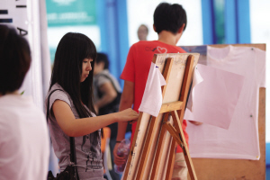 在参展项目“富力·盈溪谷”前,大二学生李嘉茹正在文化衫上画这里的别墅。“我喜欢这种西班牙风格的房子,有花园,有流水,特别美!”她的同学陈洁则把梦想中的家画成了城堡,“大部分的女孩子都梦想当公主,我也希望自己是城堡里快乐的公主。”