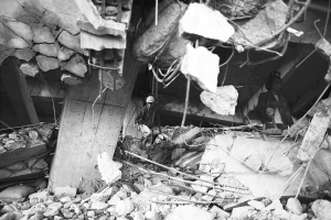 废墟中锯钢筋,危险!
