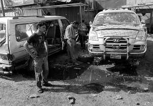 9月8日,在伊拉克首都巴格达,当地居民在被毁车辆旁查看。 当天,巴格达发生两起爆炸事件,至少造成6人死亡,35人受伤。 新华社/路透