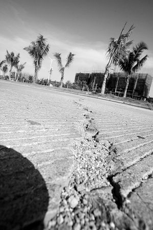 | 椰海大道路面出现多处裂痕、塌陷。