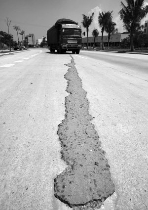 据统计,椰海大道出现裂缝、坑槽等问题的路面总长约3公里,问题主要集中在苍峄路和中央大道之间的椰海大道路面上,已经进行了修复,以防止雨水通过裂缝渗入路基而导致松软、塌陷。